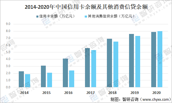 2014-2020年中國信用卡余額及其他消費信貸余額