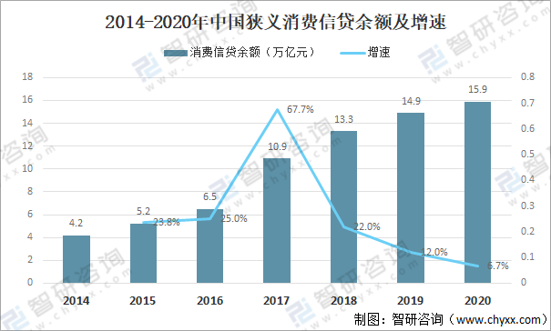 中國狹義消費信貸余額逐年增加,2020年中國狹義消費信貸余額為15.9萬億元,同比增長6.7%。