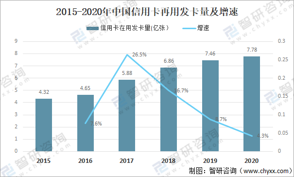 2015-2020年中國信用卡再用發(fā)卡量及增速