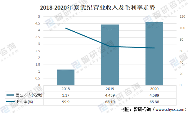 寒武紀的主營業務是各類云服務器、邊緣計算設備、終端設備中人工智能核心芯片的研發、設計和銷售,主要產品為終端智能處理器IP、云端智能芯片及加速卡、邊緣智能芯片及加速卡以及上述產品的配套軟件開發平臺。公司所研發的通用型智能芯片產品,具備靈活的指令集和精巧的處理器架構,技術壁壘高但應用面廣,可覆蓋人工智能領域高度多樣化的應用場景(如視覺、語音、自然語言理解、傳統機器學習等)。2020年寒武紀營業收入為4.589億元,同比增長3.4%,毛利率為65.38%。