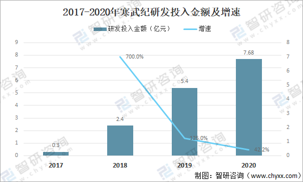 2017-2020年寒武紀研發投入金額及增速