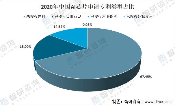 2020年中國AI芯片申請專利類型中,未授權專利占67.45%;授權專利占32.55%;其中已授權實用新型AI芯片專利占比18%;已授權發明專利AI芯片專利占比14.52%;已授權外觀設計AI專利占比為0.03%。