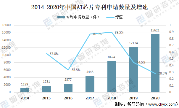 2014-2020年中國AI芯片專利申請數量及增速