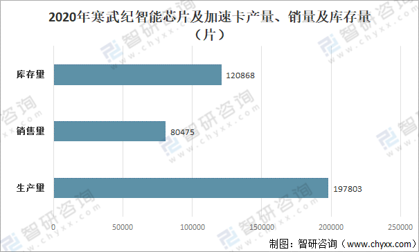 寒武紀是目前國際上少數幾家全面系統掌握了智能芯片及其基礎系統軟件研發和產品化核心技術的企業之一,能提供云邊端一體、軟硬件協同、訓練推理融合、具備統一生態的系列化智能芯片產品和平臺化基礎系統軟件。2020年寒武紀智能芯片及加速卡產量為197803片;銷售數量為80475片,庫存量有120868片。