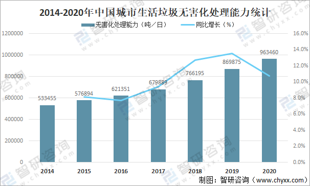 隨著城市生活垃圾的大量增加,使垃圾處理越來越困難,由此而來的環境污染等問題逐漸引起社會各界的廣泛關注。我國要實現城市生活垃圾的產業化、資源化、減量化和無害化,就必須面對混合收集、可回收物質的含量和熱值低,垃圾含水率和可生物降解的有機含量高的生活垃圾。針對這些問題,多種多樣的技術也應用而生。近年來中國城市生活垃圾無害化處理能力逐年攀升,2020年中國城市生活垃圾無害化處理能力達963460噸/日,較2019年增加了93584.90噸/日,同比增長10.8%。