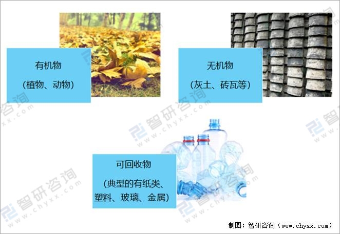 生活垃圾成份較為復雜,主要包括:餐廚廚余垃圾、廢紙、廢塑料、廢織物、廢金屬、廢玻璃、陶瓷碎片、磚瓦渣土、糞便、廢家具、廢舊電器、庭院廢物等。在我國,廣義上生活垃圾被分為三大類:有機物(植物、動物)、無機物(灰土、磚瓦等)、可回收物(典型的有紙類、塑料、玻璃、金屬)。