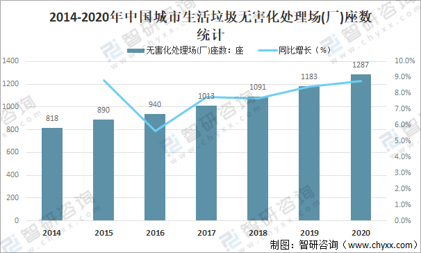 現階段,我國經濟社會迅速發展,人民群眾物質消費水平大幅提高,生活垃圾的產生量也在不斷增長,造成的生態環境污染也隨之不斷加深,逐漸成為制約我國新型城鎮化發展的重要因素。妥善有效的處理處置生活垃圾可有效提升環境承載力,促進資源回收利用,為人民群眾營造干凈整潔的宜居環境,從而加快提高我國新型城鎮化發展質量和生態文明建設水平。近年來中國城市生活垃圾無害化處理場(廠)座數快速增長,2020年中國城市生活垃圾無害化處理場(廠)共計1287座,較2019年增加了104座,同比增長8.8%。