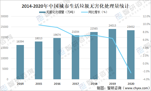 隨著中國城市生活垃圾無害化處理能力的不斷提升,無害化處理量也隨之增長,2019年中國城市生活垃圾無害化處理量達24013萬噸,較2018年增加了1448萬噸,同比增長6.4%,2020年首次出現下滑,2020年中國城市生活垃圾無害化處理量為23452萬噸,較2019年減少了561萬噸,同比減少2.3%。