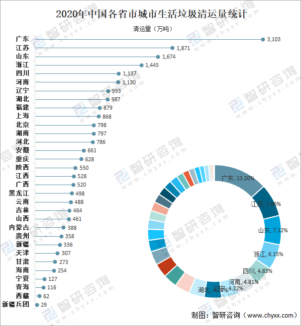 分省市來看,2020年廣東城市生活垃圾清運量為3103萬噸,占全國城市生活垃圾清運總量的13.20%,占比最大;江蘇城市生活垃圾清運量為1871萬噸,占全國城市生活垃圾清運總量的7.96%;山東城市生活垃圾清運量為1674萬噸,占全國城市生活垃圾清運總量的7.12%;浙江城市生活垃圾清運量為1445萬噸,占全國城市生活垃圾清運總量的6.15%;四川城市生活垃圾清運量為1137萬噸,占全國城市生活垃圾清運總量的4.83%。