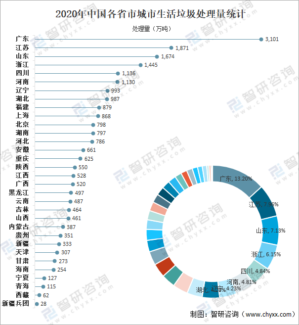 隨著中國城市生活垃圾清運量的增加,垃圾處理量也隨之增長,2020年中國城市生活垃圾處理量共計23492.68萬噸,其中廣東城市生活垃圾處理量為3101萬噸,占全國城市生活垃圾處理量的13.20%,全國排名第一;江蘇城市生活垃圾處理量為1871萬噸,占全國城市生活垃圾處理量的7.96%;山東城市生活垃圾處理量為1674萬噸,占全國城市生活垃圾處理量的7.13%;浙江城市生活垃圾處理量為1445萬噸,占全國城市生活垃圾處理量的6.15%;四川城市生活垃圾處理量為1136萬噸,占全國城市生活垃圾處理量的4.84%。