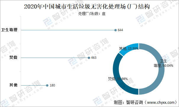 其中,衛生填埋644座,占中國城市生活垃圾無害化處理場(廠)座總數的50.04%,占比最大;焚燒463座,占中國城市生活垃圾無害化處理場(廠)座總數的35.98%。