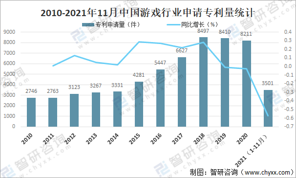 近年來中國游戲行業申請專利量呈增長趨勢,2018年中國游戲行業申請專利量達8497件,較2017年增加了1870件,同比增長28.22%,自2019年起中國游戲行業申請專利量開始逐步下滑,2020年中國游戲行業申請專利量為8211件,較2019年減少了199件,同比減少2.37%,2021年1-11月中國游戲行業申請專利量已完成3501件。