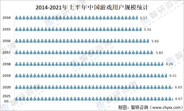 2014-2021年上半年中國游戲用戶規模統計(億人)