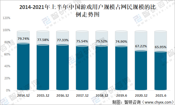 2014-2021年上半年中國游戲用戶規模占網民規模的比例走勢圖