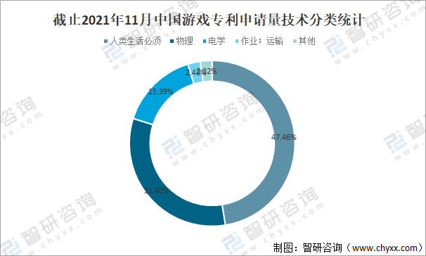 從申請專利量技術分類來看,人類生活必須專利占比最大,截止2021年11月,在中國游戲專利申請量中,人類生活必須專利申請量為25040件,占全國游戲專利申請量的47.46%,占比非常大;物理專利申請量為17096件,占全國游戲專利申請量的32.40%;電學專利申請量為8121件,占全國游戲專利申請量的15.39%;作業;運輸專利申請量為1280件,占全國游戲專利申請量的2.43%。