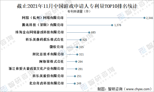 截止2021年11月,網易(杭州)網絡有限公司游戲專利申請量為2346件,全國排名第一;騰訊科技(深圳)有限公司游戲專利申請量為1376;珠海金山網絡游戲科技有限公司游戲專利申請量為685;科樂美數碼娛樂株式會社游戲專利申請量為425;微軟公司游戲專利申請量為325;努比亞技術有限公司游戲專利申請量為321;阿魯策株式會社游戲專利申請量為294;浙江依愛夫游戲裝文化產業有限公司游戲專利申請量為291;科樂美股份有限公司游戲專利申請量為251;北京奇虎科技有限公司游戲專利申請量為249。