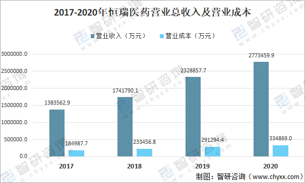 2020年恒瑞醫藥營業總收入為2773459.9萬元,同比增長19.1%;營業成本為334869萬元,同比增長15%。