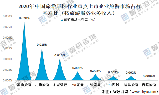 從市場占有率來看,2020年黃山旅游旅游服務業務收入占全國旅游總收入的0.0276%;九華旅游旅游服務業務收入占全國旅游總收入的0.0151%;宋城演藝旅游服務業務收入占全國旅游總收入的0.0102%;*ST圣亞旅游服務業務收入占全國旅游總收入的0.0043%;張家界旅游服務業務收入占全國旅游總收入的0.0030%;*ST西域旅游服務業務收入占全國旅游總收入的0.0022%;桂林旅游旅游服務業務收入占全國旅游總收入的0.0021%;西藏旅游旅游服務業務收入占全國旅游總收入的0.0004%。