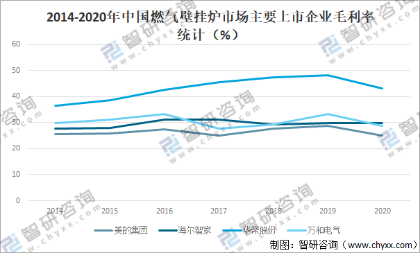 2014-2020年中國燃氣壁掛爐市場主要上市企業毛利率統計(%)