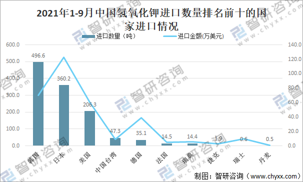 2021年1-9月中國氫氧化鉀進口數量排名前十的國家進口情況