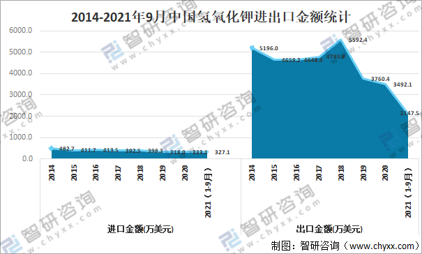 2021年1-9月中國氫氧化鉀進口金額為327.1萬美元,出口金額為2147.5萬美元。