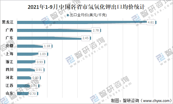 分省市來看,黑龍江出口氫氧化鉀的出口均價最高,2021年1-9月黑龍江氫氧化鉀出口均價為4.61美元/千克;廣西氫氧化鉀出口均價為2.78美元/千克;廣東氫氧化鉀出口均價為2.45美元/千克;安徽氫氧化鉀出口均價為1.18美元/千克;上海氫氧化鉀出口均價為1.03美元/千克;浙江氫氧化鉀出口均價為0.93美元/千克;四川氫氧化鉀出口均價為0.91美元/千克;河北氫氧化鉀出口均價為0.80美元/千克;江蘇氫氧化鉀出口均價為0.74美元/千克;山東氫氧化鉀出口均價為0.70美元/千克。
