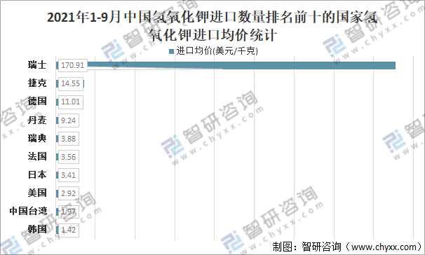 從進口來源國家/地區來看,中國從瑞士進口氫氧化鉀的進口均價最高,2021年1-9月中國從瑞士進口氫氧化鉀的進口均價為170.91美元/千克;從捷克進口氫氧化鉀的進口均價為14.55美元/千克;從德國進口氫氧化鉀的進口均價為11.01美元/千克;從丹麥進口氫氧化鉀的進口均價為9.24美元/千克;從瑞典進口氫氧化鉀的進口均價為3.88美元/千克;從法國進口氫氧化鉀的進口均價為3.56美元/千克;從日本進口氫氧化鉀的進口均價為3.41美元/千克;從美國進口氫氧化鉀的進口均價為2.92美元/千克;從中國臺灣進口氫氧化鉀的進口均價為1.97美元/千克;從韓國進口氫氧化鉀的進口均價為1.42美元/千克。