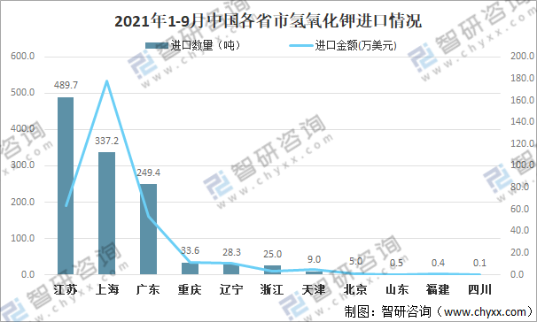 分省市來看,2021年1-9月江蘇氫氧化鉀進口數量為489.7噸,進口金額為63.6萬美元;上海氫氧化鉀進口數量為337.2噸,進口金額為178.1萬美元;廣東氫氧化鉀進口數量為249.4噸,進口金額為53.6萬美元;重慶氫氧化鉀進口數量為33.6噸,進口金額為11.3萬美元;遼寧氫氧化鉀進口數量為28.3噸,進口金額為10.4萬美元;浙江氫氧化鉀進口數量為25.0噸,進口金額為3.0萬美元;天津氫氧化鉀進口數量為9.0噸,進口金額為4.9萬美元;北京氫氧化鉀進口數量為5.0噸,進口金額為1.0萬美元;山東氫氧化鉀進口數量為0.5噸,進口金額為0.2萬美元;福建氫氧化鉀進口數量為0.4噸,進口金額為0.7萬美元;四川氫氧化鉀進口數量為0.1噸,進口金額為0.2萬美元。