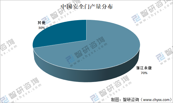 國內安全門的生產制造在世界五金名城永康呈現地域集中性的特點,永康成為全國安全門的主要生產地,并形成了完整成熟的產業鏈,永康的安全門產量占全國市場總量的70%。