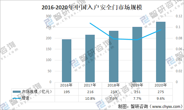 隨著中國房地產行業的快速發展,中國安全門行業市場規模不斷擴大; 2020年中國入戶安全門市場規模約為275億元,較2019年的251億元同比增長9.6%。入戶安全門需求量增長的主要原因有:1)新住宅的開發與銷售;2)二手房交易;3)住宅二次裝修;4)對門的外觀和配置升級的需求;5)安全門產品壽命周期所致置換需求。