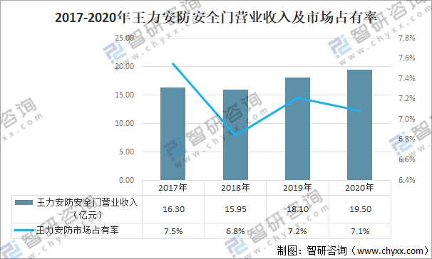 2017-2020年王力安防安全門營業收入及市場占有率