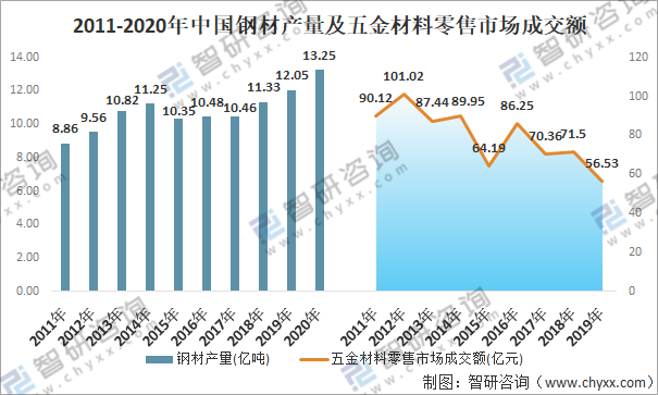 2011-2020年中國鋼材產量及五金材料零售市場成交額