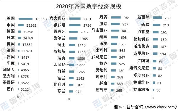 2020年全球數字經濟規模排名前三的國家分別是美國、中國、德國,數字經濟規模分別為135997億美元、53565億美元、25398億美元,日本、英國、法國、韓國、印度、加拿大、意大利依次擠進全球前十,數字經濟規模分別為24769億美元、17884億美元、11870億美元、8487億美元、5419億美元、4365億美元、3775億美元。