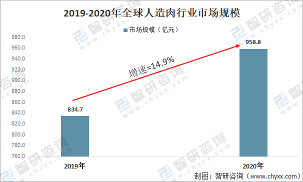 2020年全球人造肉行業市場規模達958.8億元,較2019年的834.7億元同比增長14.9%;目前,由于成本和技術等因素,市場上大多為“植物肉”。