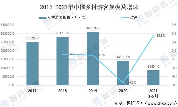 2017-2021年中國鄉村游客規模及增速