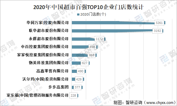 從門店數來看,2020年華潤萬家(控股)有限公司共有門店3261個;聯華超市股份有限公司共有門店3192個;永輝超市股份有限公司共有門店1172個;中百控股集團股份有限公司共有門店898個;家家悅控股集團股份有限公司共有門店868個;物美科技集團有限公司共有門店627個;高鑫零售有限公司共有門店490個;沃爾瑪(中國)投資有限公司共有門店429個;步步高集團共有門店377個;家樂福(中國)管理咨詢服務有限公司共有門店228個。