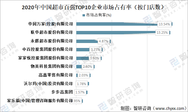 從市場占有率來看,2020年華潤萬家(控股)有限公司門店數占全國連鎖超市門店總數的13.54%;聯華超市股份有限公司門店數占全國連鎖超市門店總數的13.25%;永輝超市股份有限公司門店數占全國連鎖超市門店總數的4.87%;中百控股集團股份有限公司門店數占全國連鎖超市門店總數的3.73%;家家悅控股集團股份有限公司門店數占全國連鎖超市門店總數的3.60%;物美科技集團有限公司門店數占全國連鎖超市門店總數的2.60%;高鑫零售有限公司門店數占全國連鎖超市門店總數的2.03%;沃爾瑪(中國)投資有限公司門店數占全國連鎖超市門店總數的1.78%;步步高集團門店數占全國連鎖超市門店總數的1.57%;家樂福(中國)管理咨詢服務有限公司門店數占全國連鎖超市門店總數的0.95%。