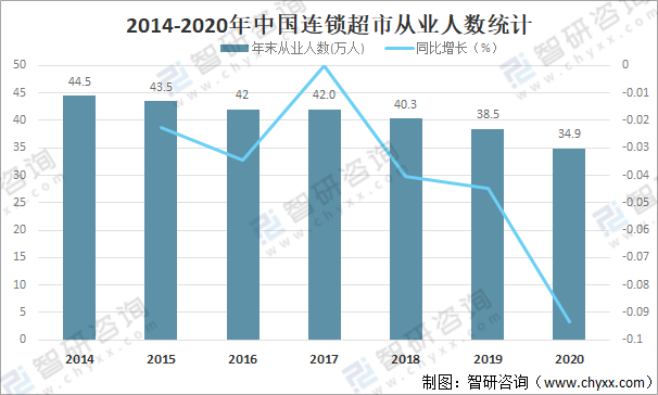 在中國連鎖超市零售營業面積減少的同時,從業人數也在減少,2020年中國連鎖超市從業人數為34.9萬人,較2019年減少了3.60萬人,同比減少9.35%。