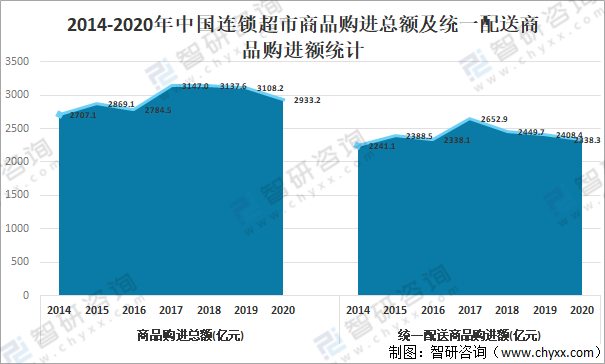 2014-2020年中國連鎖超市商品購進總額及統一配送商品購進額統計(億元)