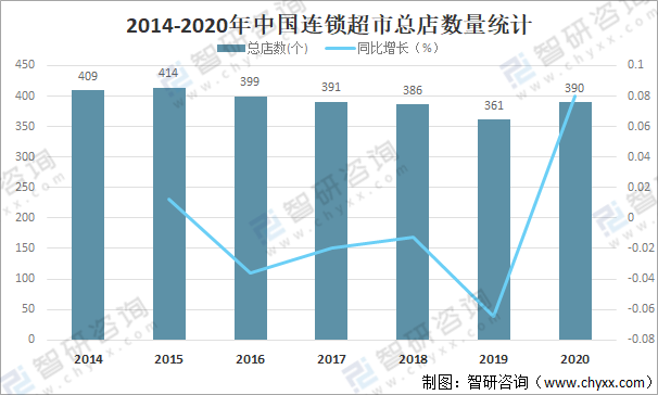 隨著人民生活水平的提高,人們的消費觀念也日益發生著變化,效率高、規模化、購物環境舒適的超級市場也越來越受到消費者的青睞。連鎖超市在中國出現已有多年的歷史,從1994年發展至今,中國連鎖超市迅速向大中城市蔓延,新增店鋪數量也在直線猛增,連鎖超市已經名副其實地成為了零售業的主流業態,為中國擴大內需、拉動經濟增長做出了重大貢獻,2020年中國共有連鎖超市總店390個,較2019年增加了29個,同比增長8.03%。
