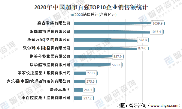 從銷售額來看,2020年高鑫零售有限公司銷售額為1059.9億元;永輝超市股份有限公司銷售額為1045.4億元;華潤萬家(控股)有限公司銷售額為878.3億元;沃爾瑪(中國)投資有限公司銷售額為874.0億元;物美科技集團有限公司銷售額為587.9億元;聯華超市股份有限公司銷售額為568.2億元;家家悅控股集團股份有限公司銷售額為279.2億元;家樂福(中國)管理咨詢服務有限公司銷售額為273.3億元;步步高集團銷售額為244.5億元;中百控股集團股份有限公司銷售額為237.2億元。