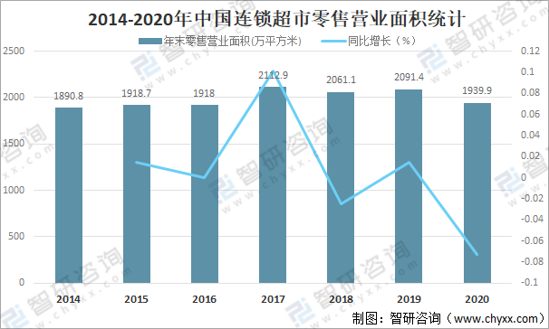 隨著中國連鎖超市門店數量的減少,零售營業面積也在減少,2020年中國連鎖超市零售營業面積為1939.9萬平方米,較2019年減少了151.50萬平方米,同比減少7.24%。