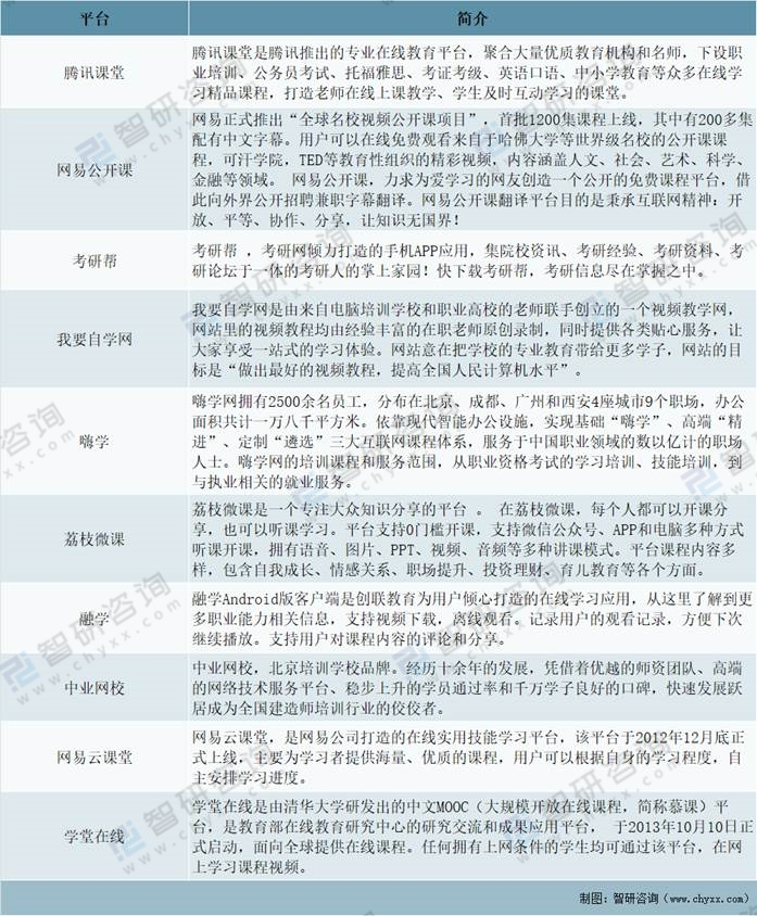中國在線高等學歷教育市場平臺主要有騰訊課堂、網易公開課、考研幫、我要自學網、嗨學、荔枝微課、融學、中業網校、網易云課堂、學堂在線等,在線高等學歷教育通過互聯網將知名高校的優質學習資源提供給社會大眾,打破時間及地域的限制,推倒高校“圍墻”。