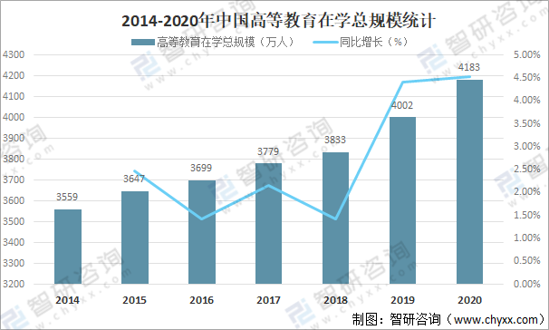 近年來中國高等教育在學總規模快速增長,2020年中國高等教育在學總規模達4183萬人,較2019年增加了181萬人,同比增長4.52%。