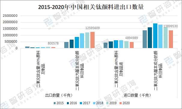 2015-2020年中國相關鈦顏料進出口數量