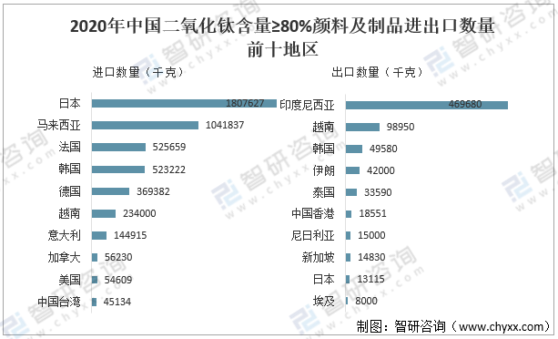 其中2020年中國二氧化鈦含量≥80%顏料及制品進口數量最多地區為日本1807627千克,占總進口數量的36.9%;二氧化鈦含量≥80%顏料及制品出口數量最多地區為印度尼西亞469680千克,占總出口數量的47.2%。