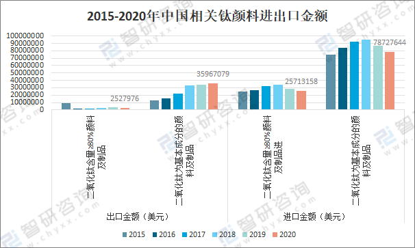 2015-2020年中國相關鈦顏料進出口金額