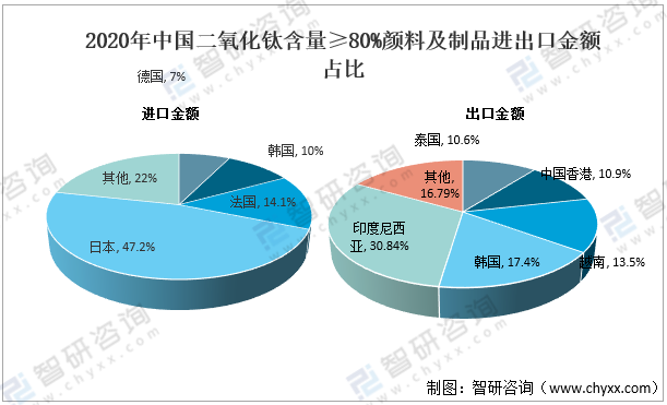 2020年中國二氧化鈦含量≥80%顏料及制品進出口金額占比