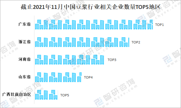 從企業數量來看,截止2021年11月中國豆漿行業相關企業數量TOP5地區依次為廣東、浙江、河南、山東、廣西。
