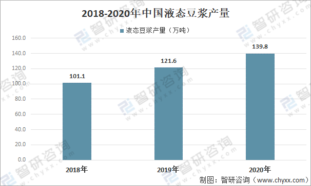 消費者愈發關注飲料的健康屬性,豆漿飲品具有低膽固醇、低飽和脂肪、含有植物蛋白、健康養生等優點,符合健康消費趨勢,植物蛋白飲品行業獲得了較快發展。2019年中國液態豆漿產量為121.6萬噸,同比增長20.3%;2020年中國液態豆漿產量約為139.8萬噸。